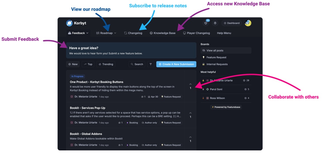 The new Korbyt Product Page also has sections for submitting feedback on system improvements, a view of our Roadmap of upcoming enhancements, and a change log of all updates.