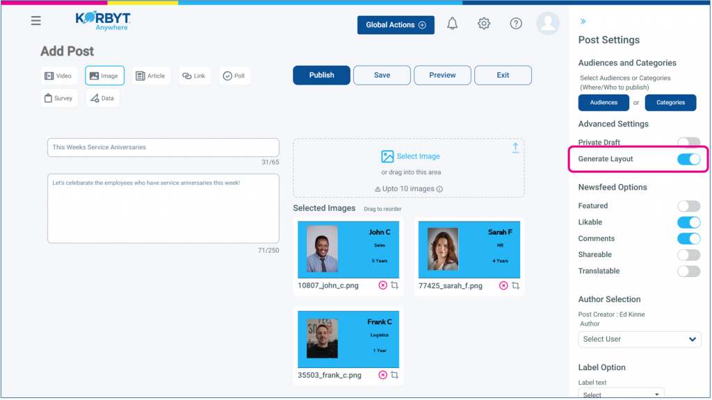 Korbyt provides the option to create a draft Signage Layout when publishing a new Image, Video, or Article Post to your Mobile & Web news feed.
