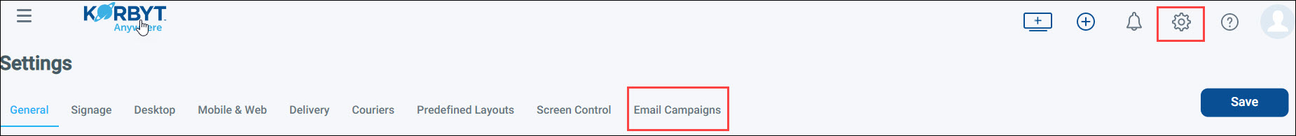 - Click the gear icon in the upper right and click the Email Campaigns tab.