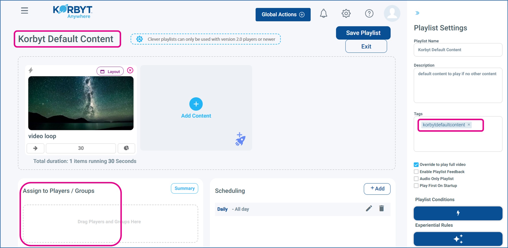 - Create a new playlist with the name “Korbyt Default Content” and with the tag “korbytdefaultcontent“.